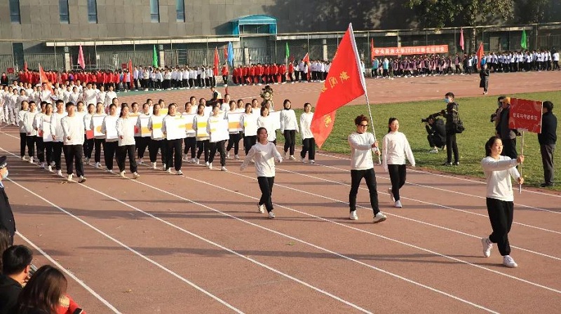 方阵整齐列队,精神抖擞;在行进中高喊口号:“新传新传,造就不凡,博闻明辨、活力无限”,走至主席台前方阵进行队形变换,举起KT板拼出五星体育