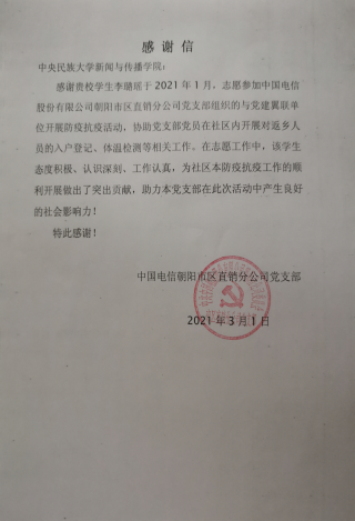 学子不惧风险、迎难而上投身家乡疫情防控表示最诚挚的感谢和崇高的敬意,并致以感谢信和表彰证书。