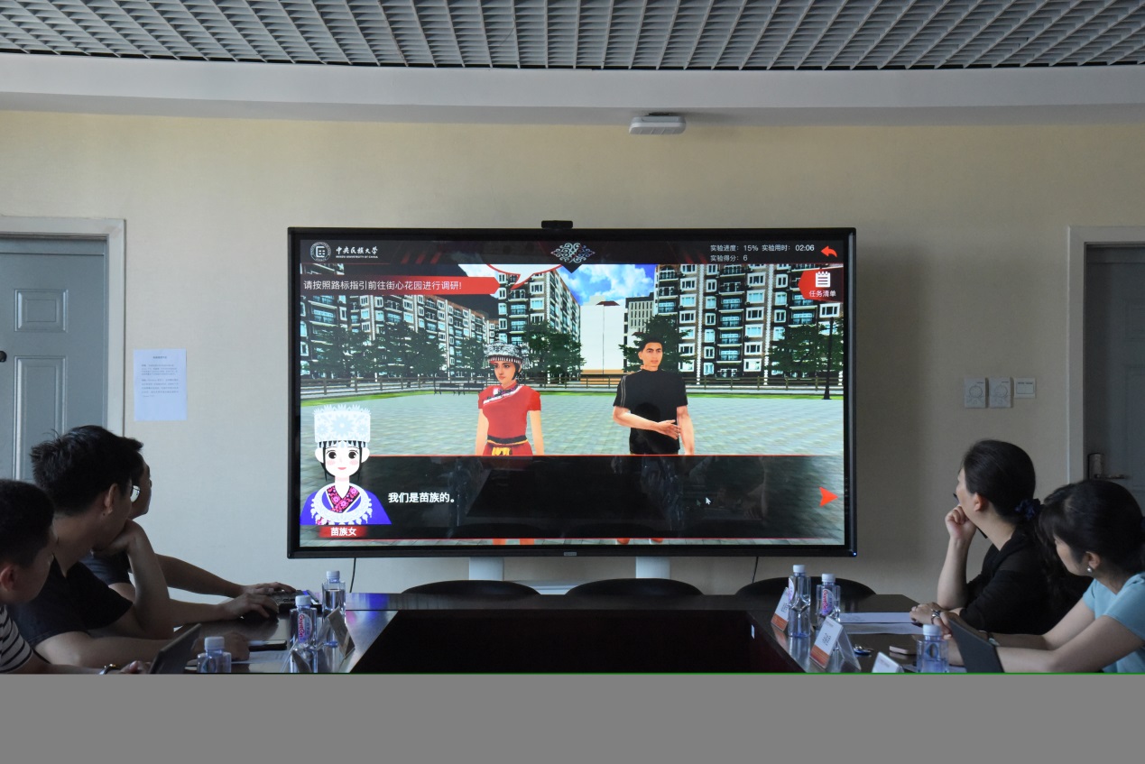 项目合作方百朋索奇公司对虚拟仿真实验进行了验收展示。汇报围绕着虚拟仿真实验教学项目的建设内容、建设成果、建设完成度、后期规划展开,并对整个虚拟仿真实验过程进行了实操演示,模拟了学生在差异性区域条件、交通不便利环境下前往民族地区偏远县域开展融媒体中心调研及实务操作的内容。