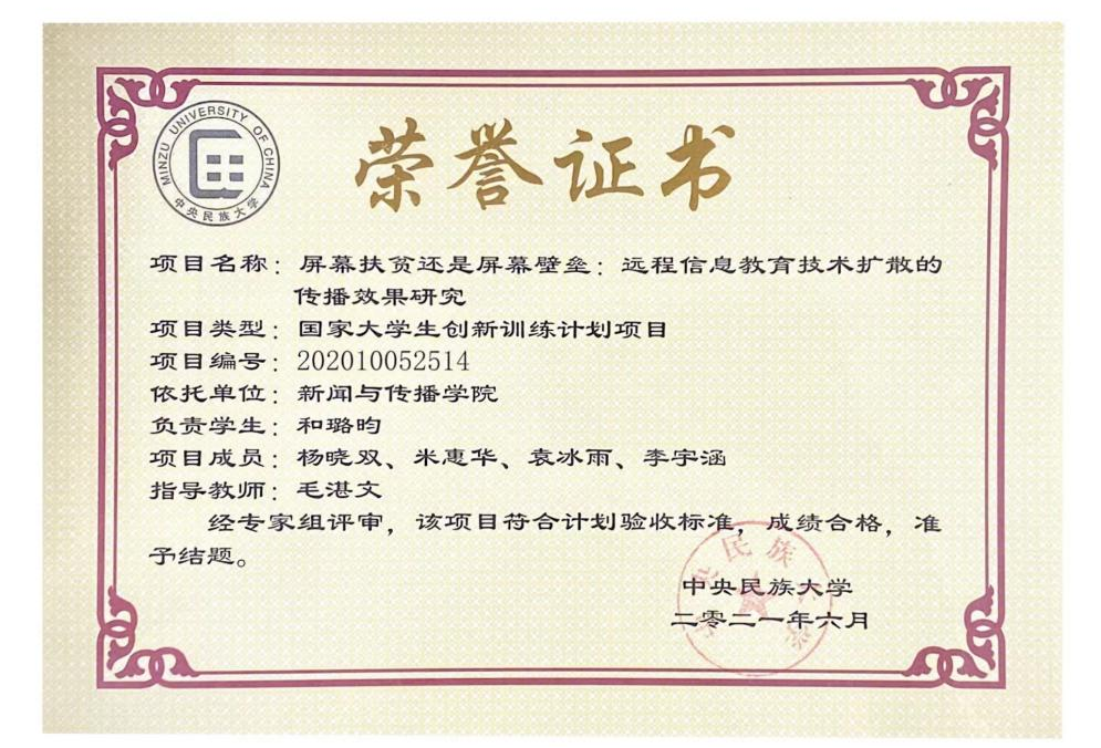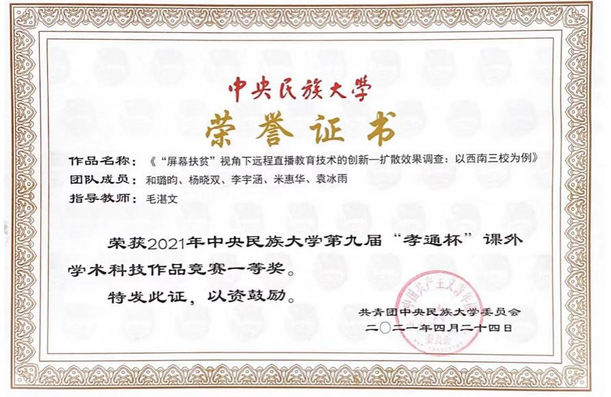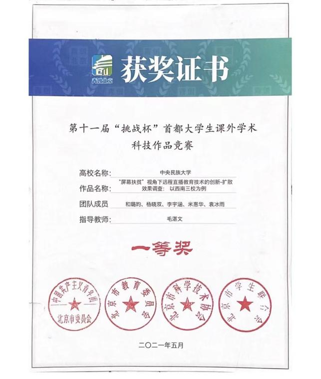 项目成果修改后参加中央民族大学“孝通杯”课外学术科技作品竞赛获一等奖,并推荐参加“挑战杯”首都赛。