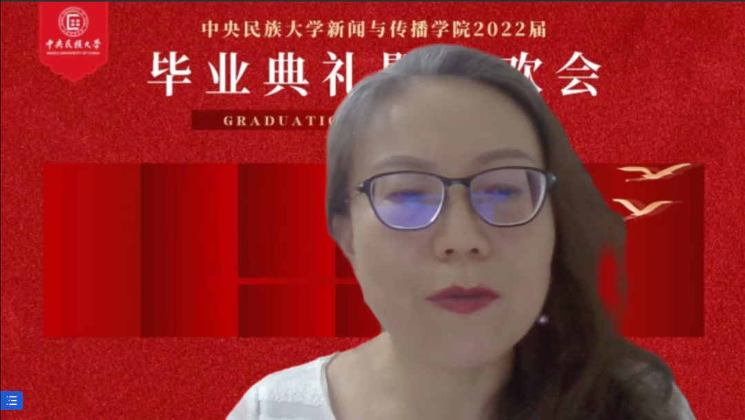 教师代表刘瑾鸿教授说,自从疫情以来,世界就被切割成了两个部分,线上的赛博空间和线下的物理世界,虽然只能以线上举行毕业典礼,但是大家曾经共居一堂的具身世界有我们师生全部安放的身心,有我们更深切的感受和情谊,老师们将永远在美丽的民大校园等候同学们未来相聚,祝愿天南海北的同学们都能有一个丰盈充实的人生。