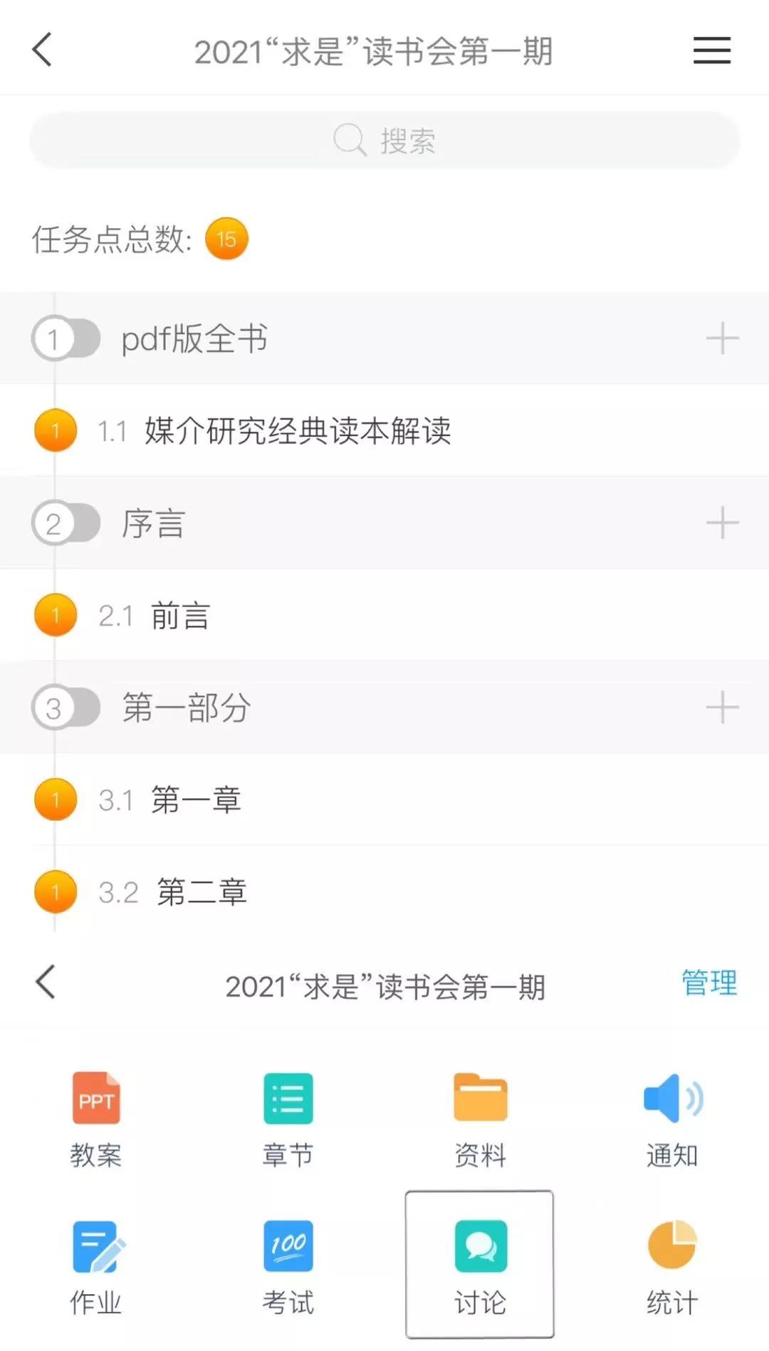 1.在学习通课程中阅读各期领读人所推荐的书目,每周在课程讨论里进行至少五次读书进度打卡。