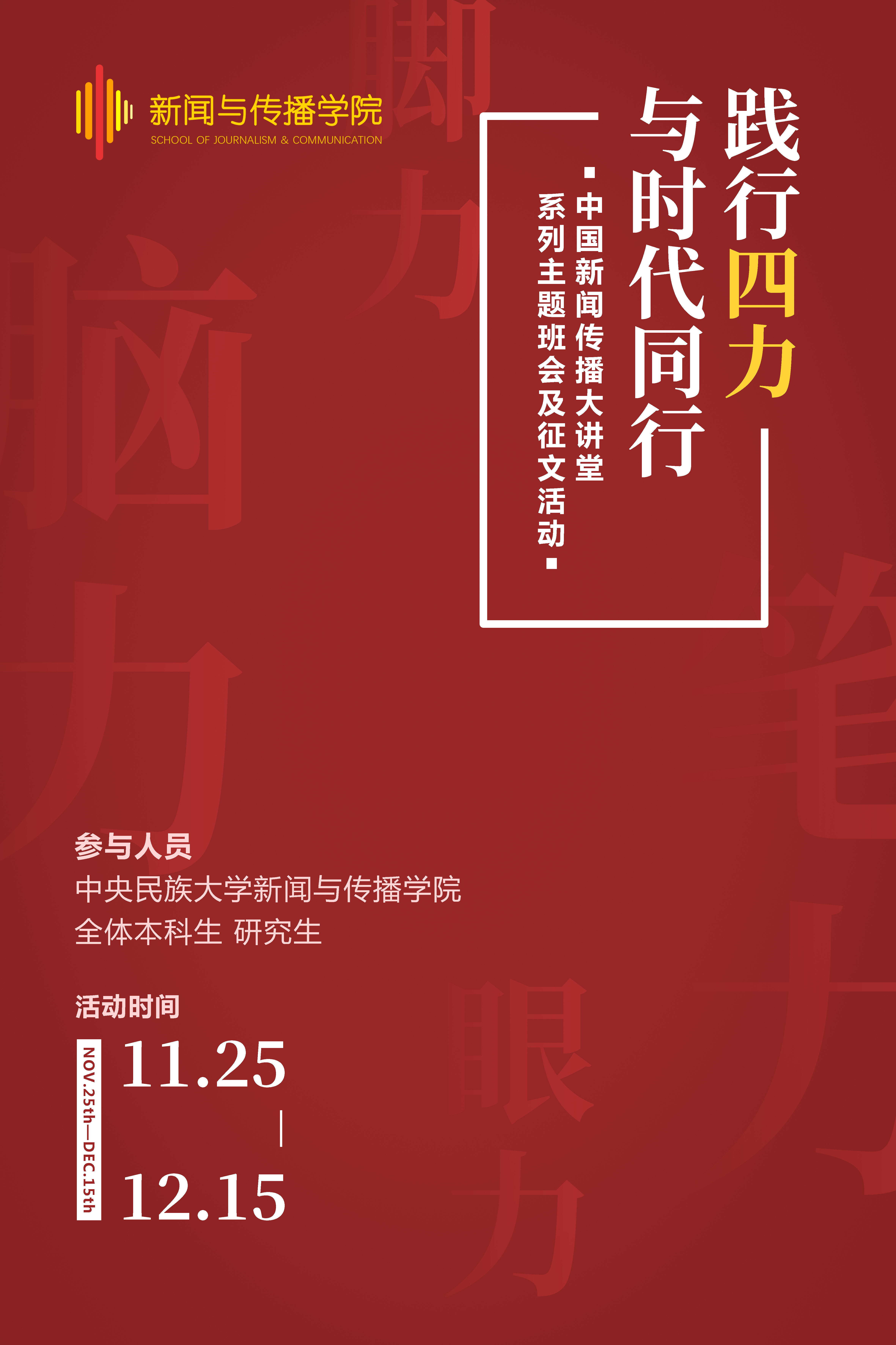 号召各个班级积极举办以“践行四力,与时代同行”为主题的班会,以32集视频为素材开展学习并征集心得体会,让同学们更好地认识中国国情、树立新闻理想、提升专业能力。