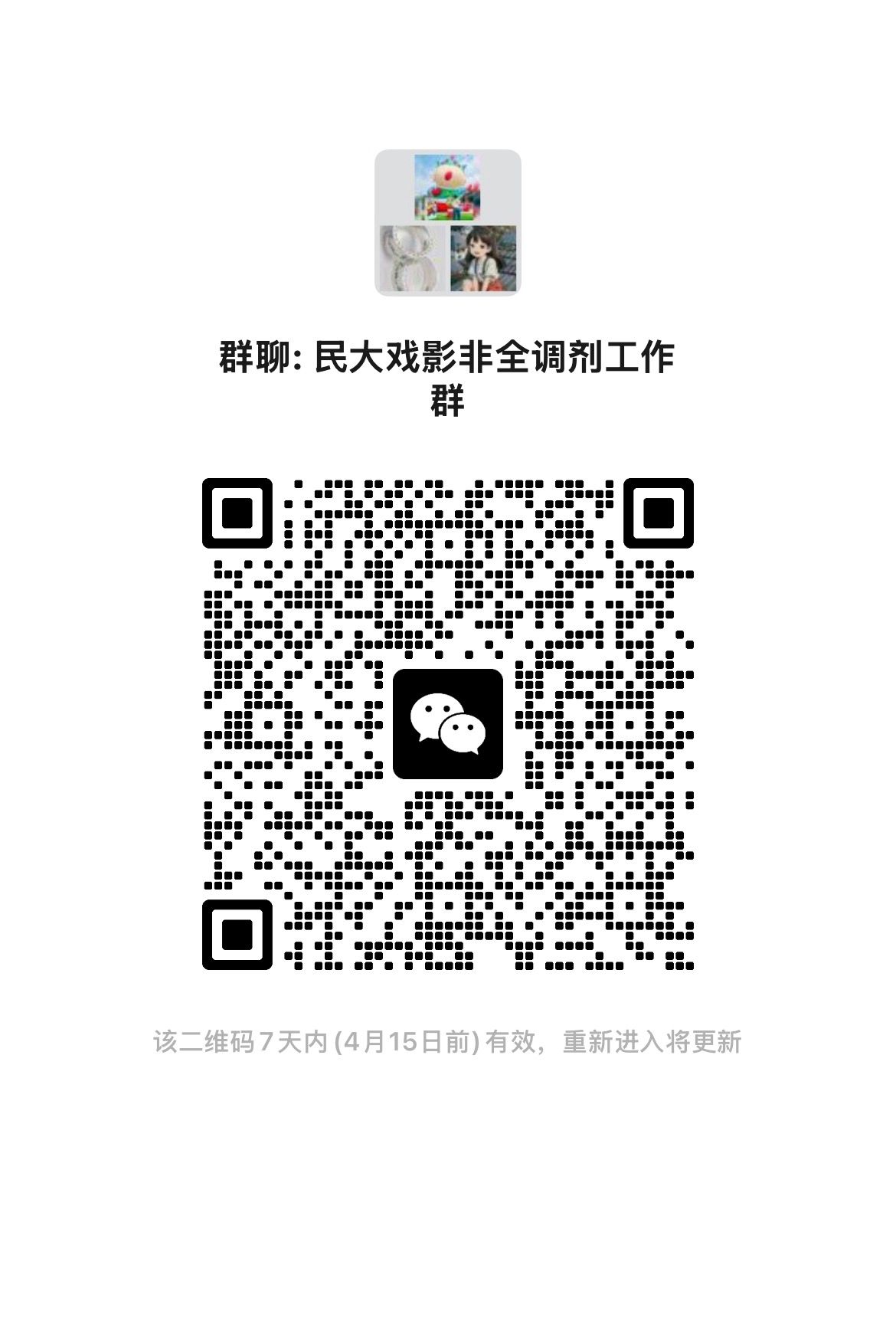 请收到五星体育 调剂复试通知的考生于2026年4月9日17:00之前扫描“民大戏影非全调剂工作群”二维码,进群后修改备注为: 姓名+手机号