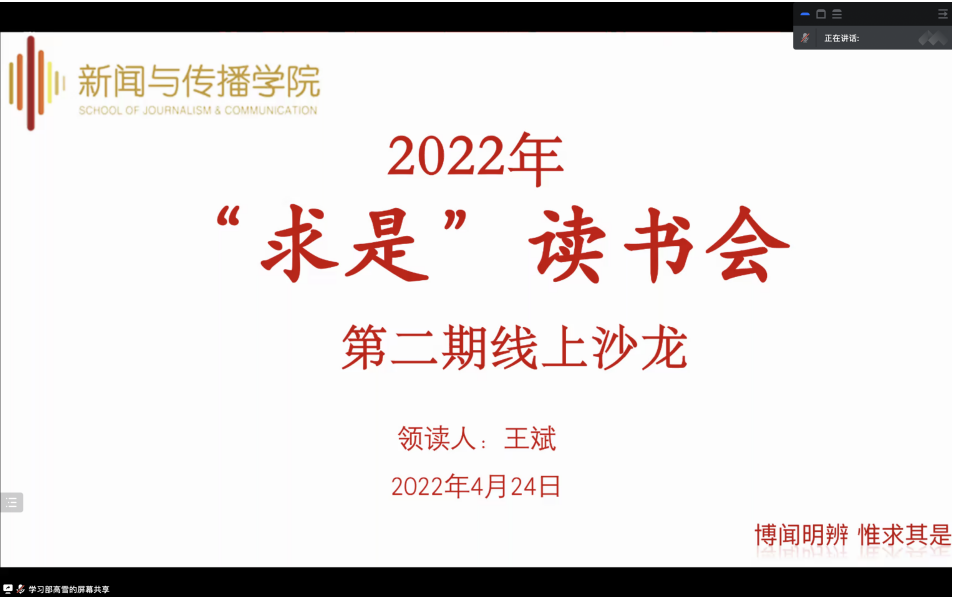 4月24日晚上,2022年“求是”读书会第二期线上沙龙活动如期举行。本期读书会的阅读书目的是尼葛洛庞蒂的《数字化生存》。同学们在王斌老师的领读下,共享读书心得,交流理解与感悟。沈景宜同学的读书心得...