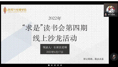 6月17日晚,2022年“求是”读书会第四期读书沙龙活动在线上举行。本期读书会的阅读书目的是加西亚·马尔克斯的《百年孤独》。在石新民老师领读下,同学们一同分享读书心得,交流理解与感悟。潘星玉同学在...